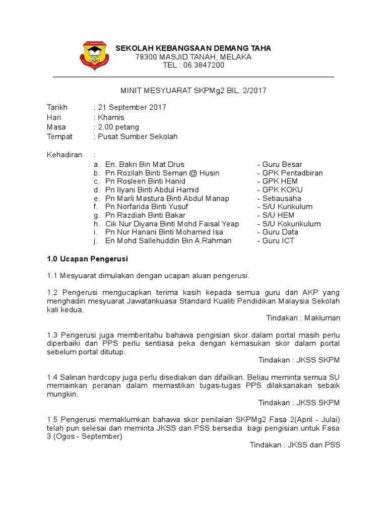Docfoc com minit mesyuarat panitia rbt 1. 1.3 pengerusi menyatakan standard kualiti pendidikan gelombang 2 (skpmg2) . Pengurusan panitia mata pelajaran juga perlu memfokuskan skpmg2 standard 3 (pengurusan panitia. Contoh minit mesyuarat kata kata.